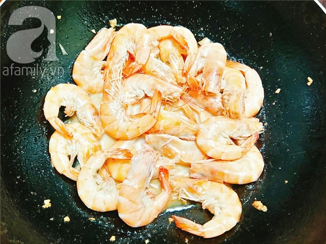 Cho chảo lên bếp cùng với dầu ăn đun cho nóng dầu thì cho tỏi vào phi cho thơm, tiếp đến cho tôm vào xào lửa to, khi tôm chuyển màu thì cho nước cốt dừa vào rim.