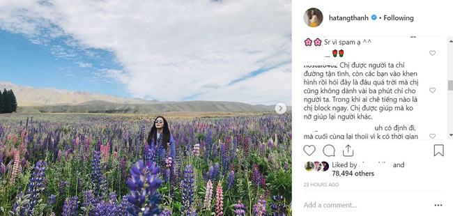 Một người hâm mộ đã bức xúc để lại dòng bình luận: "Chị được người ta chỉ đường tận tình, còn các bạn vào khen hình rồi hỏi đây là đâu quá trời mà chị cũng không dành vài ba phút chỉ cho người ta. Trong khi ai chê tiếng nào là chị block ngay. Chị được giúp mà không nỡ giúp lại người khác."