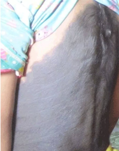 Trò chuyện với chúng tôi, bà nội của Quỳnh cho biết từ khi sinh ra toàn bộ phần lưng của bé Quỳnh bị bao phủ bởi một lớp lông khá dày. Ở những chỗ lông rậm rạp nhất, những chiếc lông dài chừng tới 3-4cm có màu đen. Những chiếc lông này chia thành hai phần, lấy cột sống làm trục đối xứng, xuôi về hai bên. Phần da lưng bé có lông phủ có màu thâm đen. Phần da màu thâm đen hiện nay đã lan rộng ra trước bụng, xuống mông bé. Những đốm đen cùng những chùm lông bao phủ hết lên 2 bên ức, phía trước ngực của Quỳnh. Ngoài ra, một vài phần da nhỏ trên cổ, cằm, trán của bé cũng đang có dấu hiệu bị thâm đen, mọc lông. Từ nhỏ đã mang trên thân thể mình những phần da và lông đen thui, nên bé Quỳnh thường xuyên bị ngứa, bị nóng rất khó chịu.