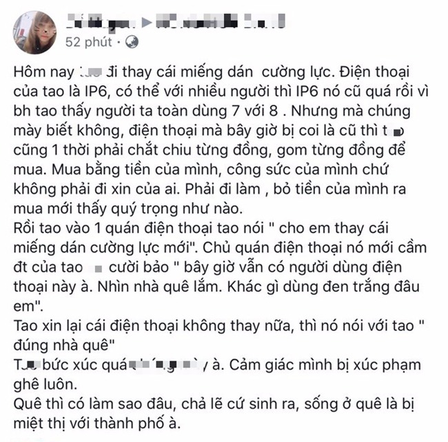 Mình liền xin lại cái điện thoại không thay nữa, thì chủ quán nói với mình "đúng là đồ nhà quê". Mình bức xúc quá các bạn ạ, cảm giác bị xúc phạm ghê luôn''.