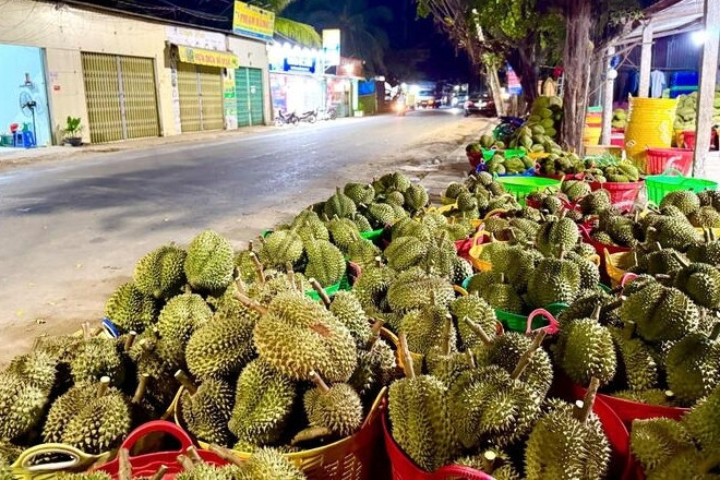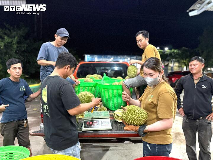 Những ngày này, dọc theo Quốc lộ 1 qua huyện Cai Lậy (Tiền Giang), không khó bắt gặp những vựa hay điểm tập kết sầu riêng hoạt động suốt ngày đêm. Sầu riêng được chất thành từng đống lớn, nhân công tất bật phân loại, cân trọng lượng.