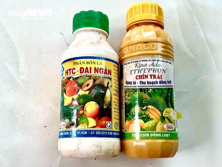 Tại đây, hai lọ dung dịch được các nhân công sử dụng, lần lượt có tên là Phân bón lá Kina Ado Ethephon và HTC Đại Ngàn. Các nhân công cho hay, họ đã sử dụng hai dung dịch này làm "thuốc nhúng" nhiều năm nay. Không chỉ sầu riêng đem bán, chính gia đình họ cũng sử dụng khi muốn ăn sầu chín ngon.