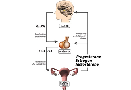 Tại não bộ, hormone hướng sinh dục GnRH được phóng thích theo nhịp, đổ về tuyến yên để kích hoạt quá trình tạo hormone. Tuyến yên được “bật đèn xanh” sẽ nhanh chóng gửi các hormone truyền tin FSH, LH xuống buồng trứng để ra lệnh sản xuất bộ các hormone sinh dục. Trong khi estrogen mang đến các đặc trưng giới tính nữ như làn da, mái tóc… thì testosterone tạo ra ham muốn, tham gia quá trình tạo xương… Progesterone vừa có vai trò lớn đối với thai kỳ, vừa giúp cơ thể kiểm soát nghiêm ngặt hoạt động của estrogen để ngăn ngừa mối nguy ung thư…
