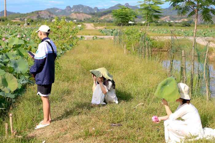 Phạm Thị Trà My (bên phải) cho biết đây là lần thứ 3 mà cô chụp ảnh ở đầm sen. "Tôi đã đi chụp sen ở một số địa điểm khác rồi nhưng thấy nơi này vẫn là đẹp nhất. Ở đây không chỉ có sen mà còn có không gian được bao quanh bởi các dãy núi tạo nên một khung cảnh kì vỹ", Trà My nói.
