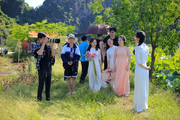 Nhiều người không ngại đường xa lẫn thời tiết nắng nóng đến đây để có những bộ ảnh đẹp. Nhóm chị Hương hôm nay đi từ 5h để kịp trang điểm, mỗi người chuẩn bị 3-5 bộ quần áo khác nhau.