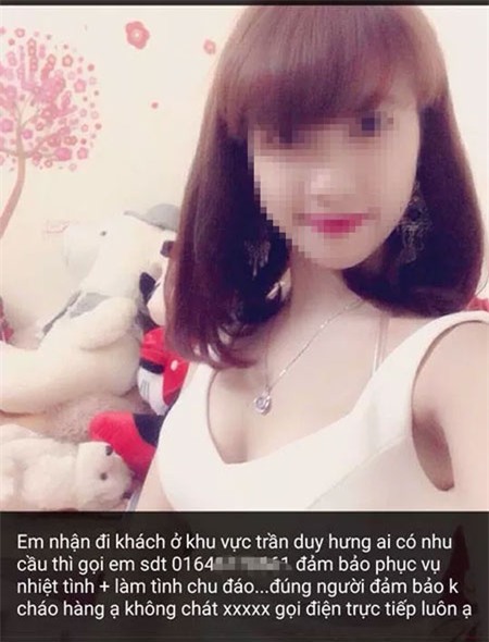 Lần theo số điện thoại 0966056... Bên cạnh những tấm ảnh khoả thân là những dòng quảng cáo với nội dung “ Em nhận đi khách ở khu vực Trần Duy Hưng, ai có nhu cầu thì gọi em theo số điện thoại ...đảm bảo phục vụ nhiệt tình chu đáo. Không tráo hàng, đảm bảo 100% giống trên Zalo không nhắn tin, cần liên hệ trực tiếp, em đi 400k một lần”