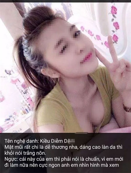 “Tên nghệ danh là Kiều Diễm Dâm, mặt mũi rất chi là dễ thương nhá, dáng cao da trắng nõn nà. Ngực em thì chuẩn, em lại mới đi tuốt lại nên ngon thôi rồi, các anh cứ nhìn hình là biết liền ”.