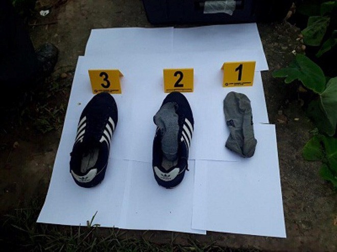 Đôi giày nhãn hiệu Adidas màu tím than và tất hung thủ để lại gần hiện trường. Ảnh do công an cung cấp.