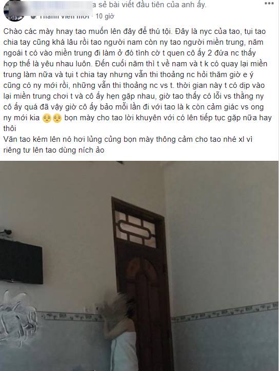 Cụ thể, theo chia sẻ của anh chàng này khi đi công tác, gặp lại người cũ nên cả hai đã đi nhà nghỉ với nhau. Bất ngờ là khi ân ái cô gái cũng thú nhận là mỗi lần đi với chàng trai là không còn cảm giác với ông người yêu mới kia. Đính kèm với tâm thư dài nửa trang đó là bức ảnh cô nàng người yêu cũ quấn khăn tắm tạo dáng trong nhà nghỉ.