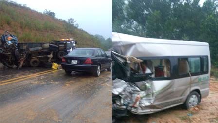 Xe khách 16 chỗ mang BKS 18B-01379 đang trên đường đón dâu từ Lào Cai về Nam Định va chạm mạnh với xe tải mang BKS 30C-4552 đi ngược chiều khiến xe tải lật nghiêng, xe khách văng sang bên đường.