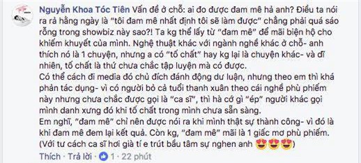 Ý kiến của Tóc Tiên nhận được khá nhiều sự đồng tình của cư dân mạng. Tuy nhiên chỉ vài phút đồng hồ sau đó, giọng ca Ngày mai cũng nhanh tay xóa bình luận này trên mạng xã hội.