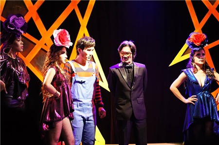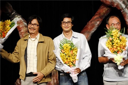 NSƯT Công Ninh cùng học trò Ngọc Tưởng và đồng nghiệp - NSƯT Việt Anh được khán giả chúc mừng sau một vở diễn
