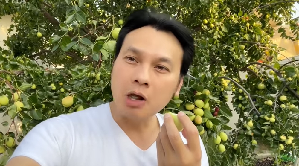 Mọi người nhìn đấy, tôi trồng mát tay nên táo trái nào cũng to bự, mướt mát, nhìn phát thèm. Tôi vừa bứt một trái để ăn, ngọt quá trời ngọt. Tôi chỉ tưới nước thôi, không bón phân, xịt thuốc gì hết mà nó vẫn lớn thế này, trái mọc thành từng chùm, nhìn ham quá.