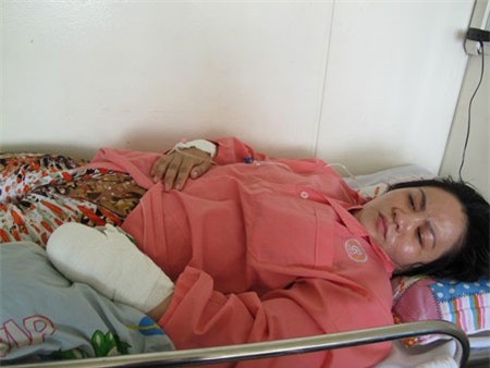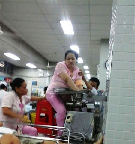 Chị Loan được chuyển vào phòng mổ cùng máy xay thịt. Ảnh Phạm Dũng chụp sáng 6-5 |