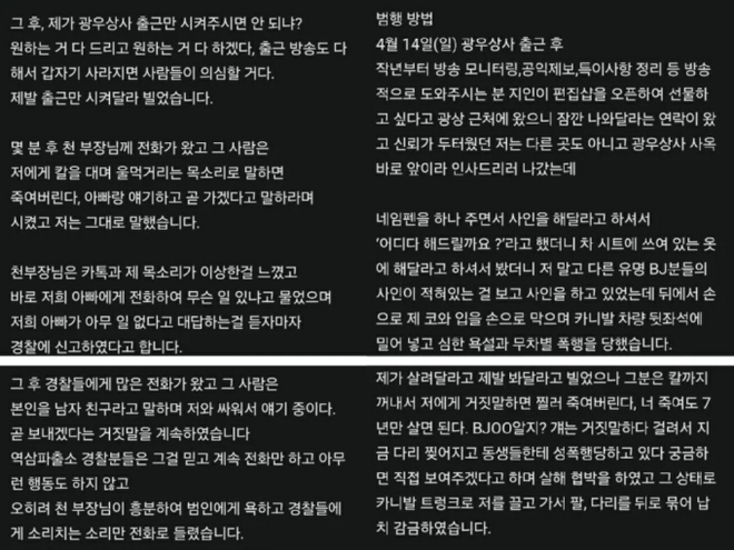 "Anh ta còn đe dọa: 'Cô đừng hòng nói dối tôi nhé. Biết BJOO phải không? Cô ta đã bị bọn đàn em xâm hại tình dục vì dám không trung thực'. Ngay sau đó, Go đẩy tôi vào cốp xe, trói chặt tay chân tôi. Go giằng lấy điện thoại của tôi, còn bắt tôi khai ra nhóm chat của các thành viên trong gia đình. Rồi anh ta đóng giả làm tôi nhắn tin cho quản lý Chun rằng, tôi sẽ tới chỗ làm muộn vì bận lo chuyện của bố. Song song với đó, Go tiếp tục mạo danh tôi gửi tin nhắn vào nhóm chat gia đình nhằm thông báo về việc tôi không đi làm hôm nay", nữ ca sĩ bức xúc vạch trần thủ đoạn của người quản lý thân cận.