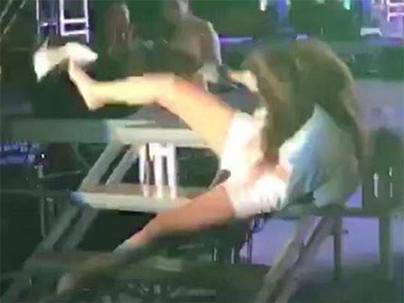 Đoạn clip ghi lại cảnh một nữ ca sĩ té từ trên sân khấu xuống khi đang biểu diễn khiến người hâm mộ thót tim.