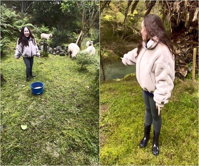Trong vườn có đồng cỏ xanh rì. Trương Phương và người yêu còn nuôi cả những con cừu. Nữ diễn viên cho cừu ăn ở bãi cỏ bên bờ suối.