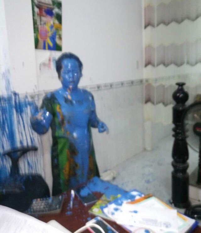 Toàn thân bà Chi bê bết sơn, từ đầu đến chân. Con trai bà Chi, lúc đó đứng bên cạnh cũng bị văng sơn vào đầu.