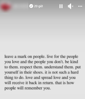 Cụ thể, tài khoản M.P. viết: 'Leave a mark on people. Live for the people you love and the people you don't be kind to them, respect them, understand them, put yourself in their shoes. It is not such a hard thing to do. Love and spread love and you will receive it back in return that is how people will remember you'. (Tạm dịch: Để tạo ấn tượng trong lòng mọi người. Sống vì những người bạn yêu thương và cả những người bạn không yêu. Tôn trọng họ, hiểu họ, đặt mình vào vị trí của họ. Đó không phải là một điều gì đó quá khó khăn. Hãy yêu thương và lan tỏa yêu thương, bạn sẽ nhận lại được nhiều hơn thế, đó là cách mọi người sẽ nhớ đến bạn).
