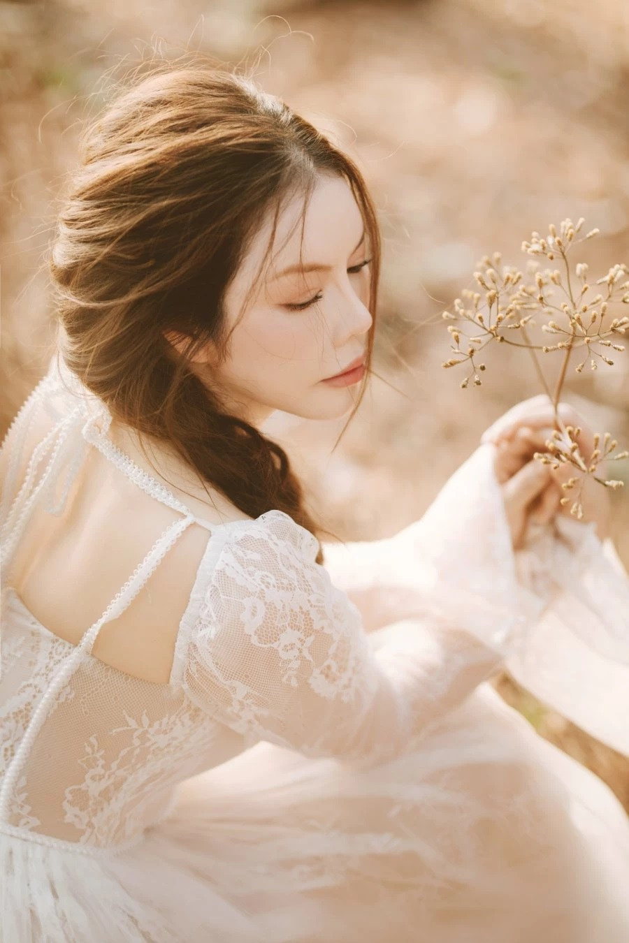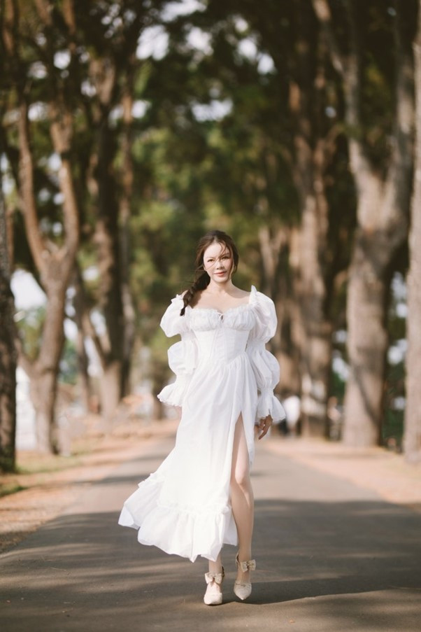 Mở đầu hành trình là biển Hồ Chè. Giữa không gian thanh khiết ấy, Lý Nhã Kỳ xuất hiện như một "nàng thơ". Cô khoác lên mình một chiếc đầm maxi màu trắng tinh khôi, chất liệu mềm mại bay bổng trong gió, gợi nhớ đến thời tân cổ điển. Mái tóc buông xõa tự nhiên, trang điểm trong suốt, nhấn vào đôi môi căng mọng.