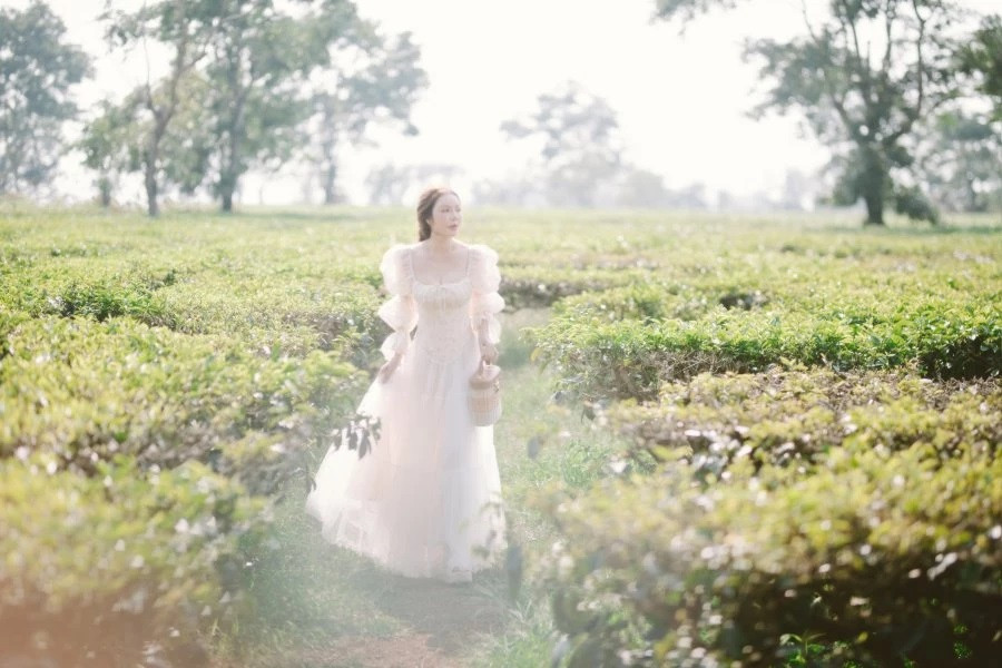 Hình ảnh Lý Nhã Kỳ đứng giữa đồi chè, đôi mắt nhìn xa xăm ra mặt hồ phẳng lặng, tạo nên một khung cảnh vừa thanh lịch, vừa lãng mạn, tôn vinh vẻ đẹp dịu dàng, thuần khiết và sự giao hòa tuyệt đối với thiên nhiên. Bộ ảnh ở đây không chỉ khoe trang phục, mà còn kể câu chuyện về sự thư thái, tĩnh tại trong tâm hồn.