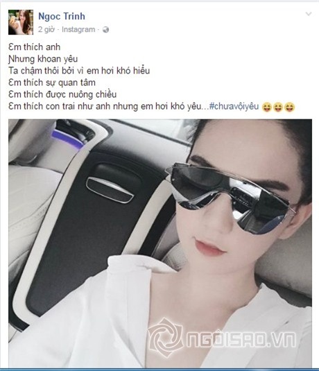 Cách đây ít giờ, Ngọc Trinh chia sẻ: “Em thích anh. Ɲhưng khoan уêu. Ta chậm thôi bởi vì em hơi khó hiểu. Em thích sự quan tâm. Em thích được nuông chiều. Em thích con trai như anh nhưng em hơi khó уêu”.