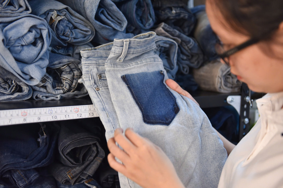 Thắm cho biết, để làm được một chiếc túi từ đồ jean cũ, người thợ phải trải qua nhiều công đoạn tỉ mỉ: Chọn lựa chất liệu phù hợp, xác định phần vải có thể tái sử dụng, xử lý chất liệu, cắt ghép họa tiết, cuối cùng ráp lại thành sản phẩm hoàn chỉnh.
