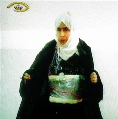 Sajida al-Rishawi cho thấy khối thuốc nổ buộc quanh người cô trong chiến dịch tấn công các khách sạn ở Jordan năm 2005. Ảnh: Reuters |