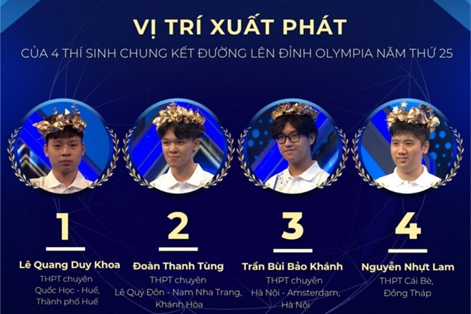 Trận chung kết Đường lên đỉnh Olympia năm thứ 25 sẽ là cuộc đấu trí căng thẳng của bốn nhà leo núi và được dự đoán sẽ mang đến nhiều bất ngờ khó đoán khi bốn thí sinh đều ngang tài ngang sức. Chương trình sẽ diễn ra vào 8h30 sáng Chủ nhật (ngày 26/10/2025) tại trường quay Đài Truyền hình Việt Nam và 4 điểm cầu. Trận Chung kết sẽ được truyền hình trực tiếp trên kênh VTV3.