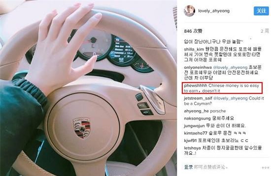 Mới đây trên tài khoản Instagram của mình, Ah Yeong đã “khoe khéo” bức ảnh chụp bàn tay bên vô-lăng bánh lái xế sang có nhãn hiệu Porsche kèm dòng chú thích: “Quá dễ kiếm tiền ở Trung Quốc”. Bức ảnh ngay lập tức đã thu hút được đông đảo sự chú ý của người hâm mộ.