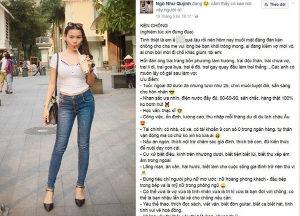 Trong bài tuyển chồng này, cô khẳng định rằng ý định của mình là nghiêm túc và muốn tìm kiếm người đàn ông có tài chính ổn định, đáp ứng được điều kiện của cô.