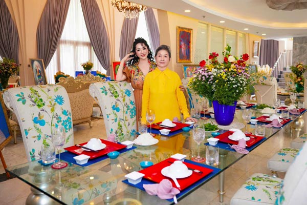 Phòng khách nhà hoa hậu rộng rãi, với sức chứa khoảng 200 người. Đây là nơi cô thường tổ chức tiệc vào các dịp lễ, Tết, sinh nhật, mời bạn bè là doanh nhân, nghệ sĩ tới chơi.