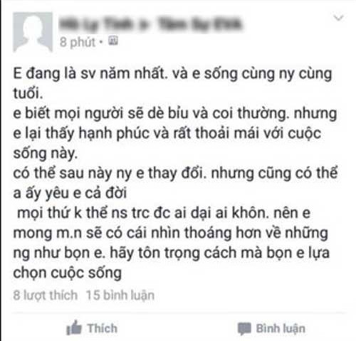 Người này chia sẻ: "Em đang là sinh viên năm nhất, em đang sống cùng người yêu bằng tuổi. Em biết mọi người sẽ dè bỉu và coi thường nhưng em lại thấy hạnh phúc và rất thoải mái với cuộc sống này.