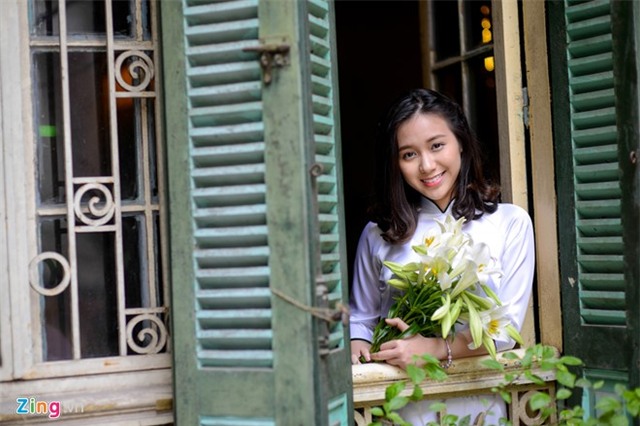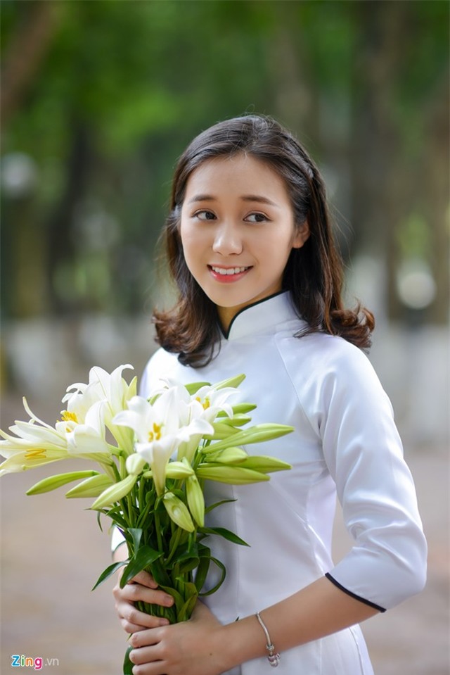 Phạm Phương Khanh, nữ sinh lớp 12 Sử, trường THPT Hà Nội - Amsterdam, chọn cho mình trang phục truyền thống của người phụ nữ Việt cùng những cánh hoa loa kèn trắng tinh khôi để lưu giữ hình ảnh đẹp của tuổi học trò. |