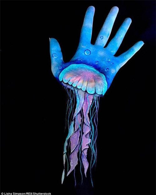 tranh 3D ấn tượng như tác phẩm sứa nhiều màu sắc này ngay trên cánh tay