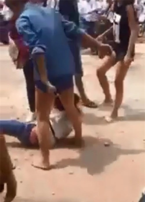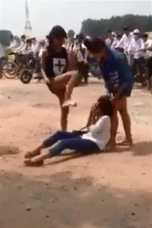 Hai người phụ huynh ra can ngăn rồi cả hàng chục người có mặt khác - phần lớn là các em học sinh đều bất lực đứng nhìn cô gái áo trắng tội nghiệp hứng những cú đạp, cái tát đầy tức giận từ phía 2 nữ sinh kia.