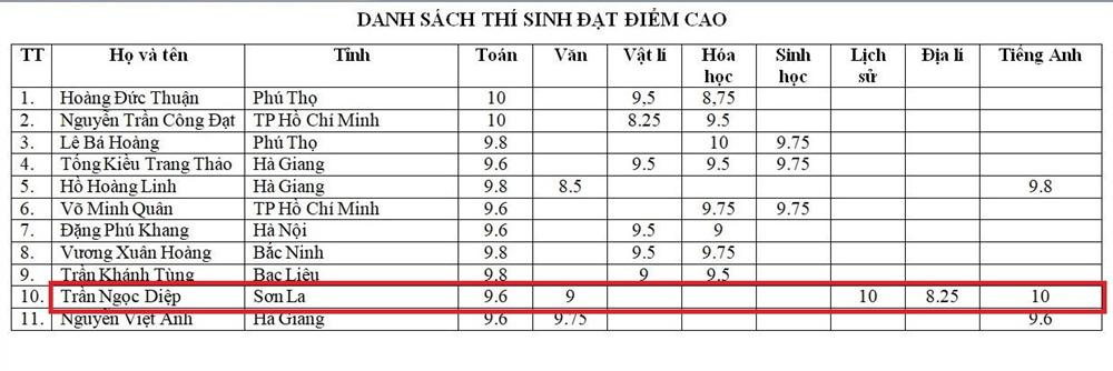 Theo nguồn tin của VietNamNet từ Bộ GD-ĐT, với mức điểm này, nữ sinh của tỉnh Sơn La đã trở thành thí sinh có điểm thi cao nhất khối D1 (Toán, Ngữ văn, Tiếng Anh) và nhiều tổ hợp khác như C03 (Ngữ văn, Toán, Lịch sử); D09 (Toán, Lịch sử, Tiếng Anh) và D14 (Ngữ văn Lịch sử, Tiếng Anh).