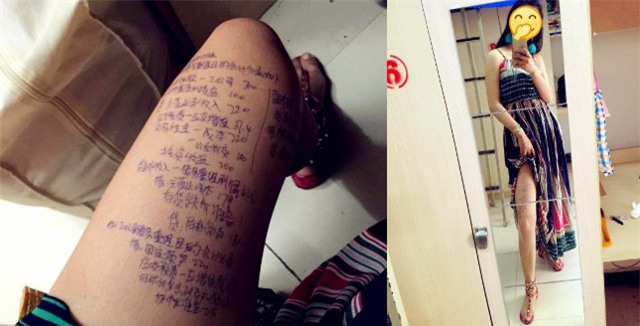 Cô gái viết đầy kiến thức kế toán trên đùi.