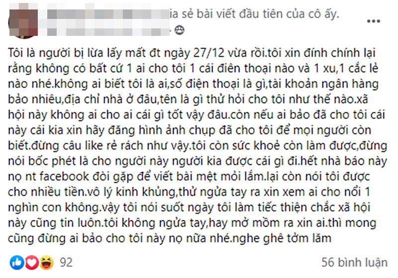 Nguyên văn lời chia sẻ như sau: 'Tôi là người bị lấy mất điện thoại ngày 27/12 vừa rồi. Tôi xin đính chính lại là không có bất kỳ ai cho tôi 1 cái điện thoại nào và 1 xu, 1 cắc lẻ nào nhé. Không ai biết tôi là ai, số điện thoại là gì, tài khoản ngân hàng bao nhiêu, địa chỉ nhà ở đâu, tên là gì thử hỏi cho tôi như thế nào.