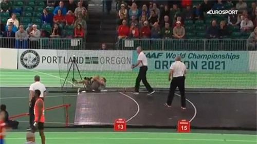 VĐV Kendell Williams của Mỹ suýt chút nữa khiến nhiếp ảnh gia Victor Sailer phải nhập viện trong phần thi đẩy tạ.