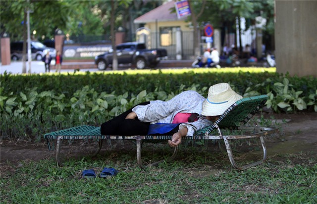Những ngày này, người dân Hà Nội cũng vật vã dưới cái nắng 40 độ. Nhiều người tìm đến các hồ để giải nhiệt, những người lao động thì tìm đến bãi cỏ để tránh nắng.