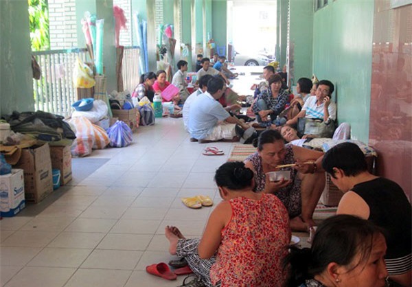Tại các bệnh viện, người nhà và bệnh nhân nằm, ngồi la liệt ở các hành lang. |