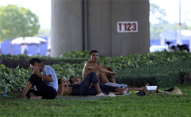 Dọc hai bên đường Nguyễn Xiển (Thanh Xuân - Hà Nội), nơi bãi cỏ xanh dưới đường trên cao, rất nhiều người lao động đã tìm đến để nghỉ ngơi tránh cái nắng gay gắt.