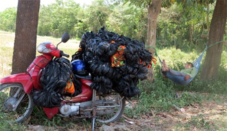 nắng nóng ông vẫn kèm theo chiếc võng, buổi trưa ông tìm các tán cây để nằm. |