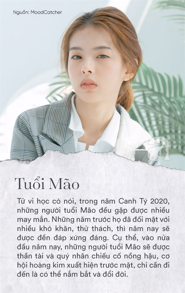 Tử vi học có nói, trong năm Canh Tý 2020, những người tuổi Mão đều gặp được nhiều may mắn. Những năm trước họ đã đối mặt với nhiều khó khăn, thử thách, thì năm nay sẽ được đền đáp xứng đáng. Cụ thể, vào nửa đầu năm nay, những người tuổi Mão sẽ được thần tài và quý nhân chiếu cố nồng hậu, cơ hội hoàng kim xuất hiện trước mặt, chỉ cần đi đến là có thể nắm bắt và đổi đời. Từ giữa năm trở đi, cuộc sống được nâng lên tầm cao mới, mọi khó khăn đều được cải thiện, nếu biết phát huy thế mạnh thì cuộc sống thăng hoa viên mãn.