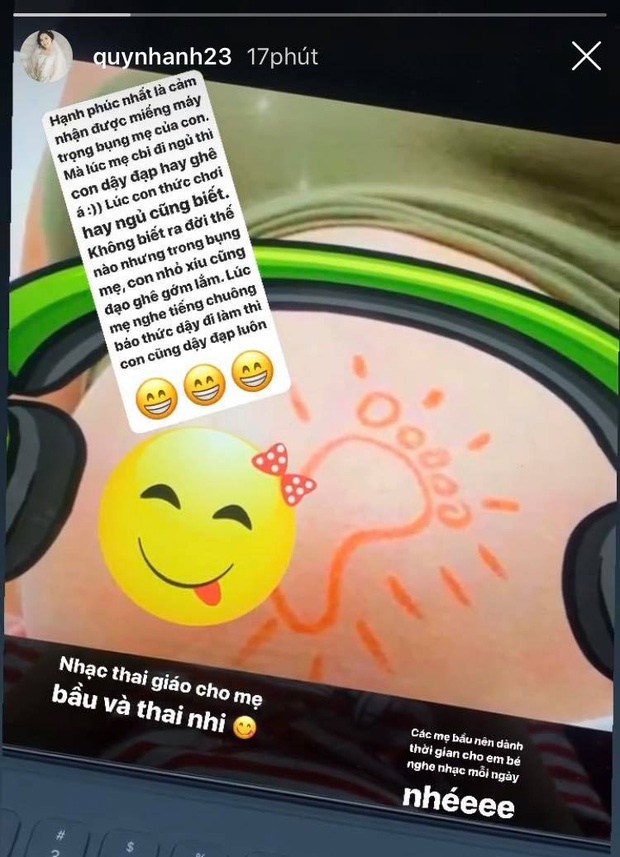 Đêm 15/5, trên Instagram cá nhân, Quỳnh Anh đăng bức ảnh chụp bàn tay trái của cô với hình biểu tượng gương mặt buồn rầu kèm theo lời than thở: "Nhẫn cưới hồi mua rộng hơn 1 size, giờ đã chật ních. Tay chân phù hết ra chứ". Mang bầu nên Quỳnh Anh lên cân thấy rõ, tay đeo nhẫn vì thế cũng to hơn thời chưa lấy chồng. Dù vậy, gương mặt vợ Duy Mạnh vẫn giữ được nét xinh xắn, dịu dàng.