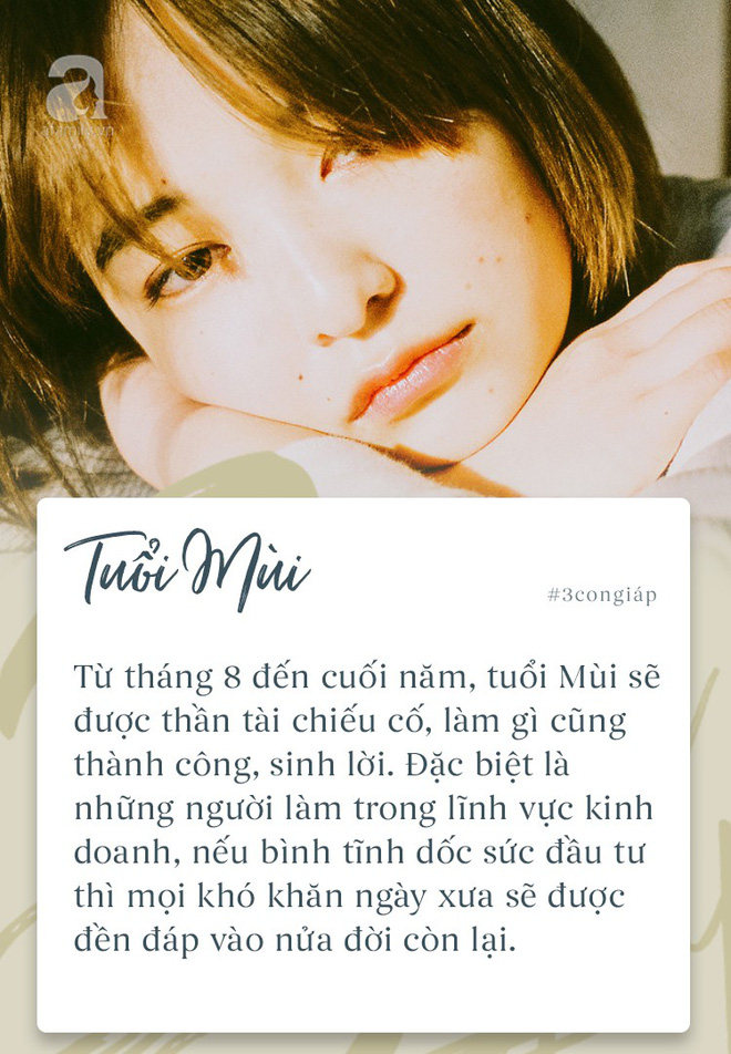 Trong số những con giáp, tuổi Mùi luôn là con giáp không gặp được nhiều may mắn. Mặc dù họ là những người hiền lành, đôn hậu, luôn lao động chăm chỉ và cần mẫn nhưng lại không thể gặp đúng thời điểm để phát huy, vì vậy họ chỉ ở trong vòng tròn an toàn của mình. Vài năm trước đây, tài chính tuổi Mùi khá eo hẹp, tuy nhiên trong năm nay mọi chuyện đã thay đổi. Đây là thời điểm tuổi Mùi có khả năng tạo dựng sự nghiệp ổn định, được quý nhân giúp đỡ và có cơ hội làm giàu. Từ tháng 8 đến cuối năm, tuổi Mùi sẽ được thần tài chiếu cố, làm gì cũng thành công, sinh lời. Đặc biệt là những người làm trong lĩnh vực kinh doanh, nếu bình tĩnh dốc sức đầu tư thì mọi khó khăn ngày xưa sẽ được đền đáp vào nửa đời còn lại. Hậu vận tuổi Mùi sẽ có cuộc sống sung túc đầy đủ bên gia đình, không những thế sự nghiệp vững vàng từ đời này qua đời khác. Cùng chờ xem nhé!