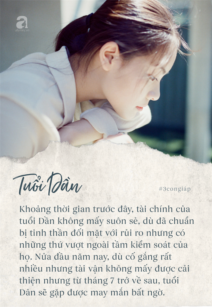 Trời sinh tuổi Dần là những con giáp có tính cách mạnh mẽ, độc lập và luôn tự chủ trong cuộc sống. Họ luôn tham vọng và sẵn sàng đối mặt với mọi khó khăn để đạt được thành công như mong muốn. Trong công việc, tuổi Dần có sự cạnh tranh về tài chính, họ có khát vọng làm giàu và nâng cao chất lượng cuộc sống. Tuy nhiên, do vận may chưa đến nên họ vẫn chưa thể có bước đột phá. Khoảng thời gian trước đây, tài chính của tuổi Dần không mấy suôn sẻ, dù đã chuẩn bị tinh thần đối mặt với rủi ro nhưng có những thứ vượt ngoài tầm kiểm soát của họ. Nửa đầu năm nay, dù cố gắng rất nhiều nhưng tài vận không mấy được cải thiện nhưng từ tháng 7 trở về sau, tuổi Dân sẽ gặp được may mắn bất ngờ. Đây chính là cơ hội để họ thay đổi tất cả, mọi rắc rối nợ nần đều được giải quyết êm đẹp, không những thế họ còn tạo được tài sản nhỏ, làm tiền đề để phát triển sau này.