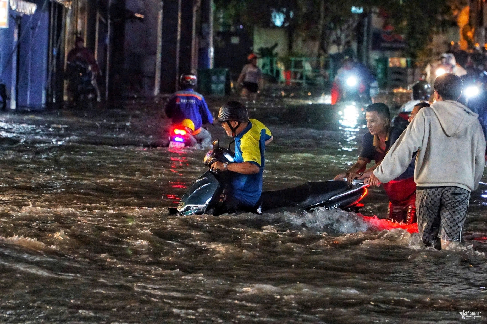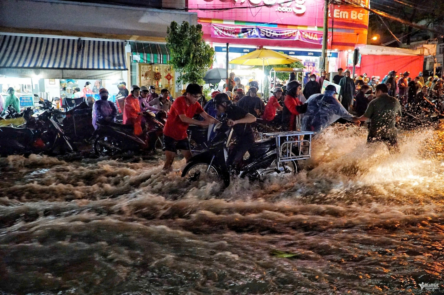 Mưa lớn hàng loạt tuyến đường ngập sâu khiến việc đi lại, sinh hoạt, buôn bán của người dân bị đảo lộn. Trong ảnh, các tuyến đường quanh chợ Thủ Đức ngập lênh láng vào thời điểm 19h30. Hàng loạt xe chết máy, người dân phải bì bõm lội nước, đẩy xe rất khó khăn.