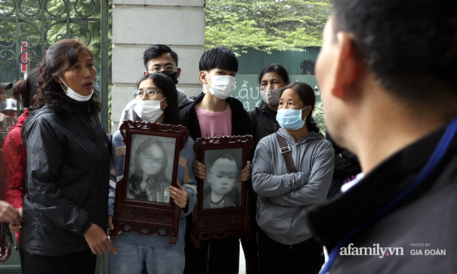 Người thân chị H. ôm theo di ảnh của hai mẹ con chị có mặt tại toà từ sớm.